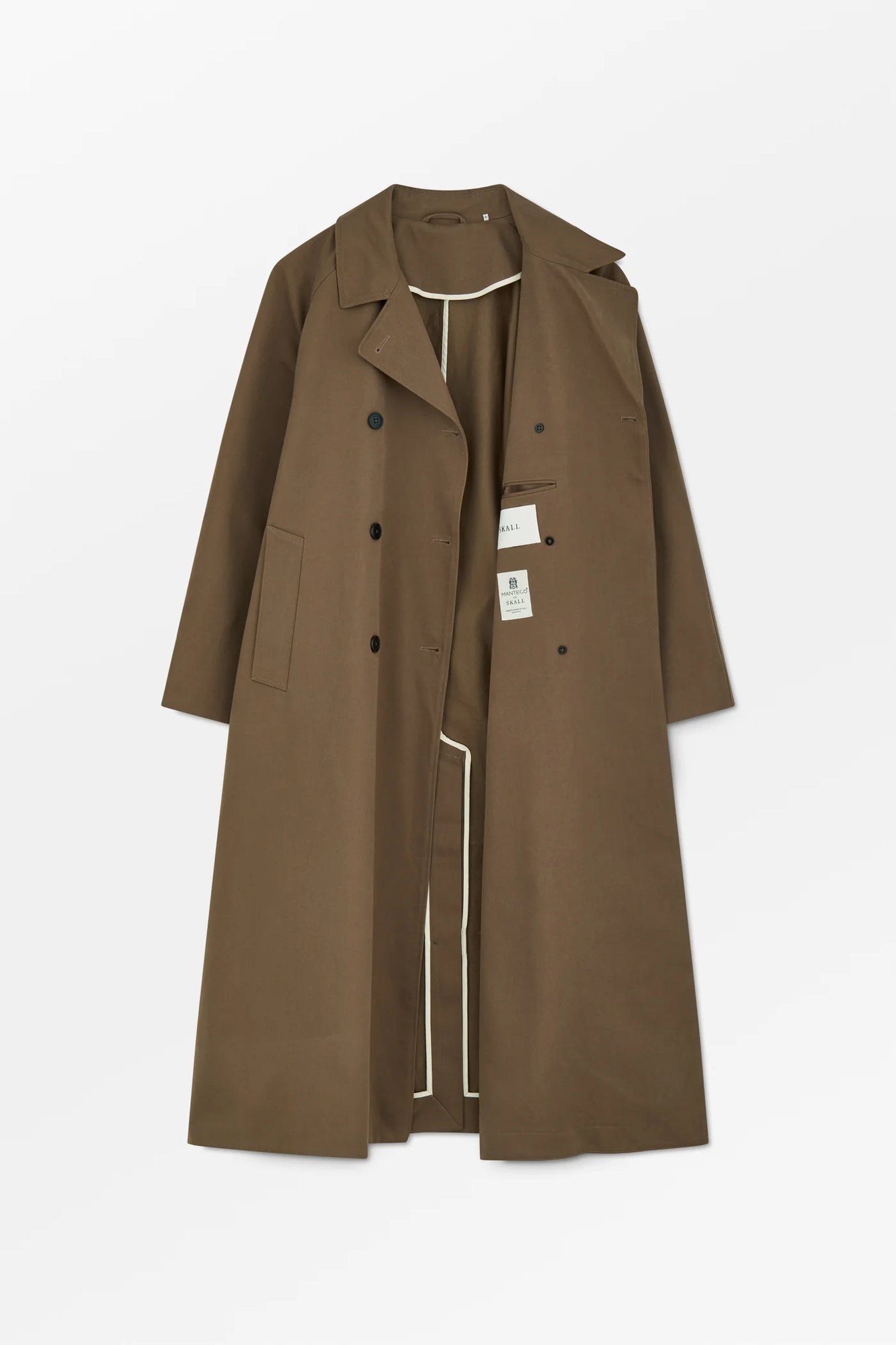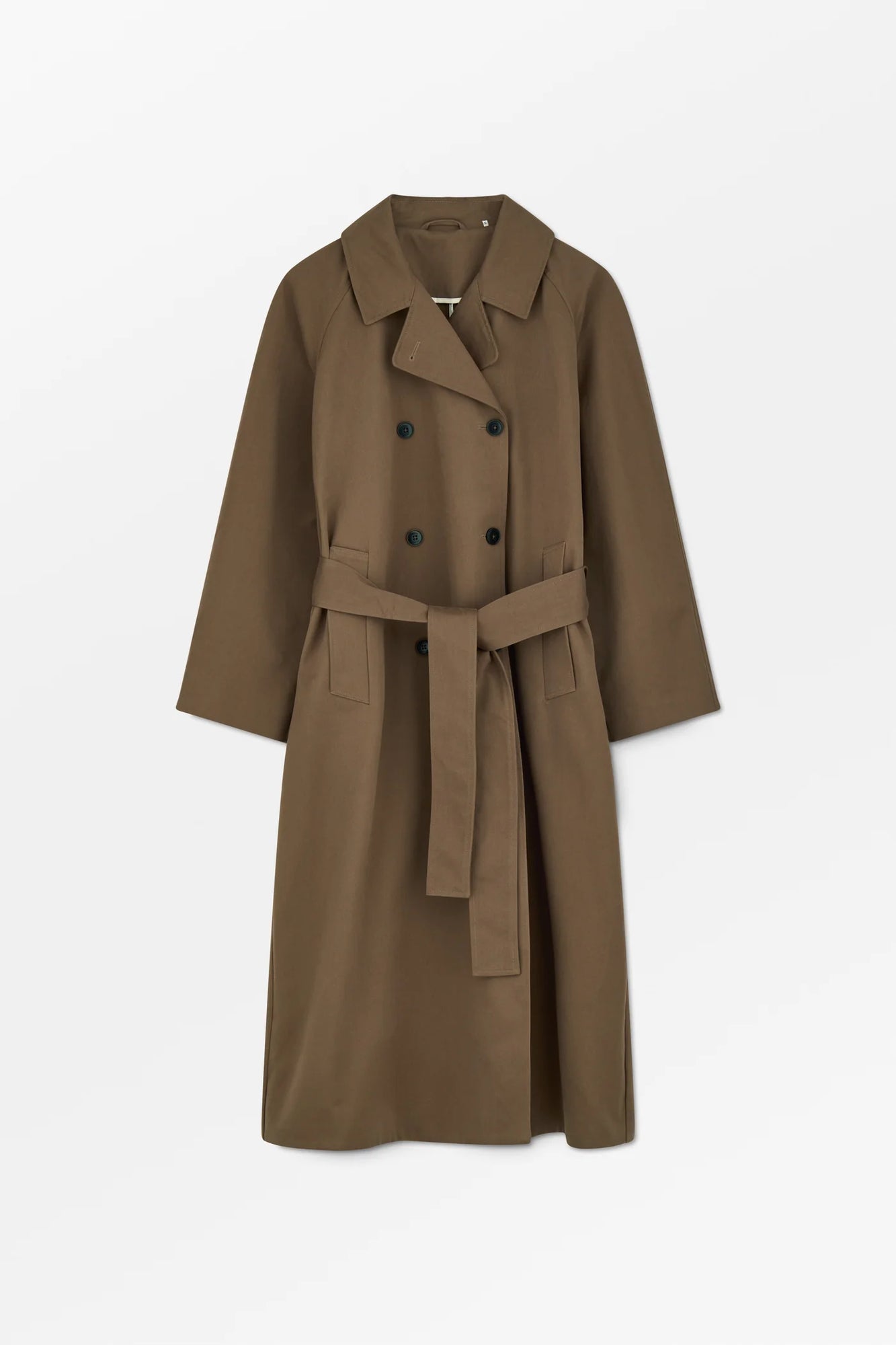 Spring coat is an oversized trenchcoat with double-breasted front and classic detailing.